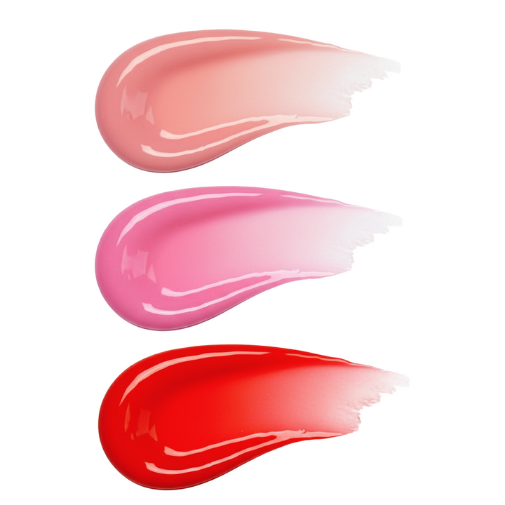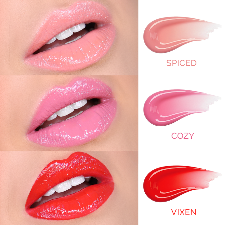 Three luxurious holiday-ready lip glazes in nude, pink, and red with rich colour and cushiony comfort.